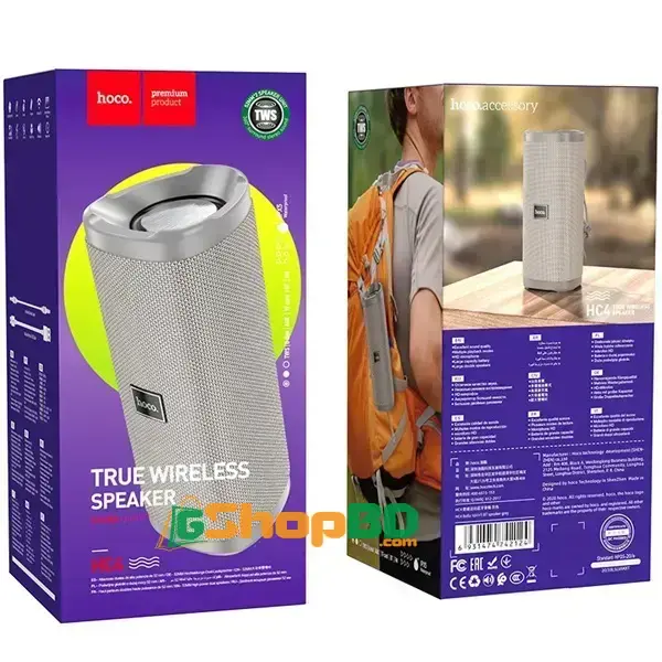 The Hoco HC4 Bella Bluetooth Speaker is a small, portable speaker that is perfect for taking on the go. It has a Bluetooth 5.0 connection, a 1500mAh battery, and a 52mm speaker driver. It supports a variety of playback modes, including Bluetooth, FM radio, TF card, USB flash drive, and AUX. It also has a TWS mode that allows you to pair two speakers together for stereo sound.